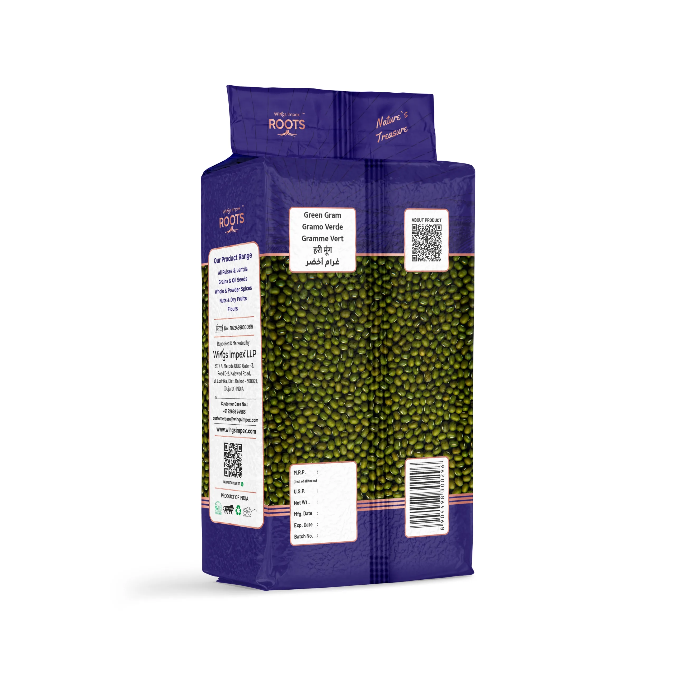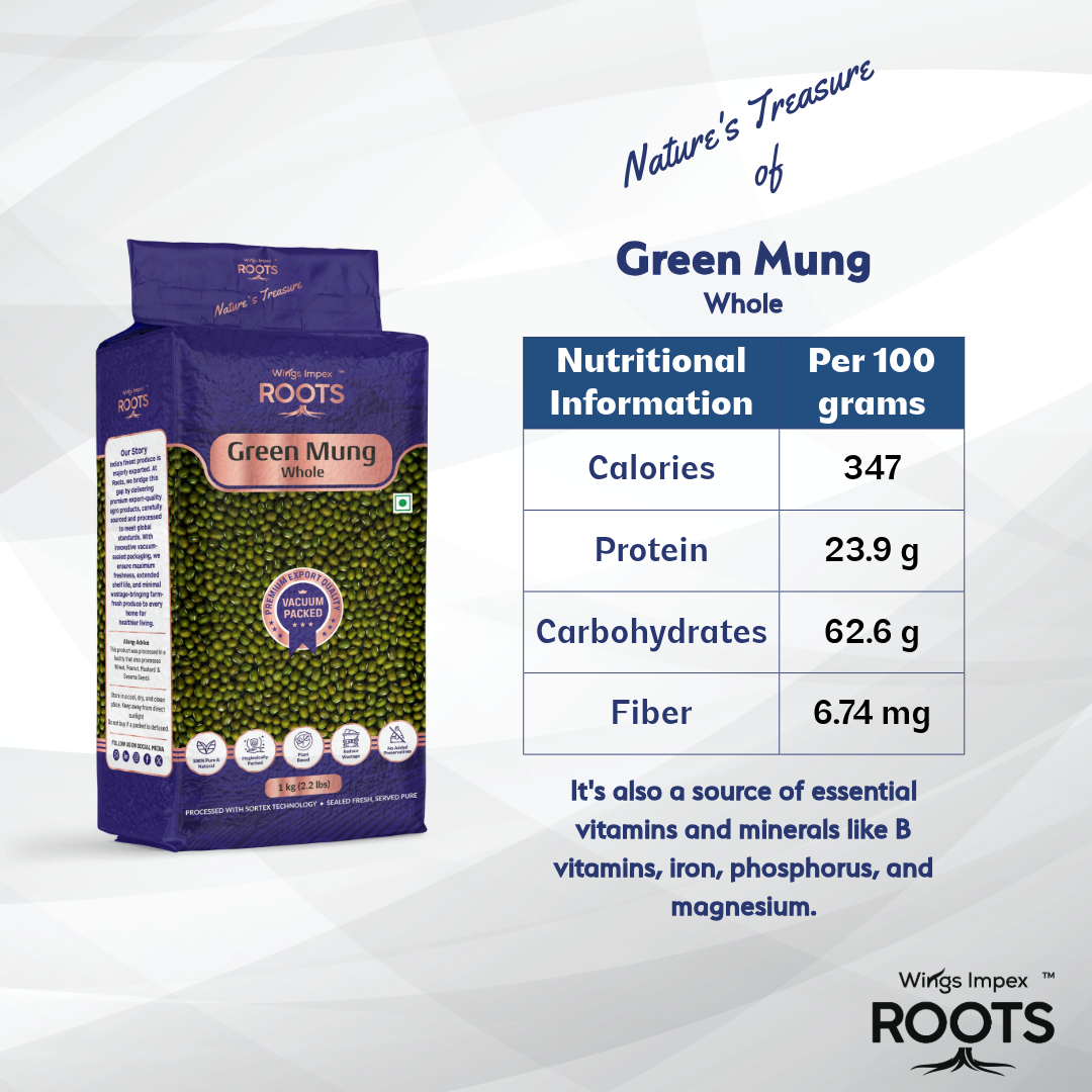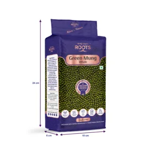 • Roots Green Mung Whole is a nutritious legume packed with plant-based protein and essential nutrients.