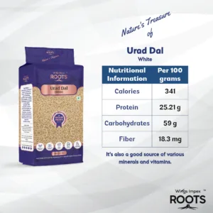 • Roots Adad Dal (White) is a high-quality split urad dal without skin, known for its smooth texture and mild flavor.